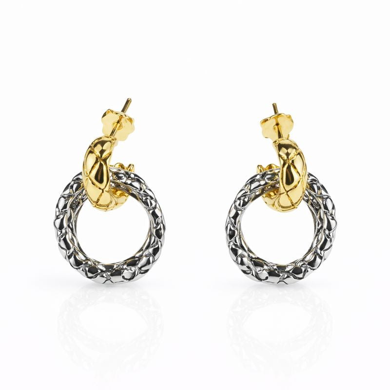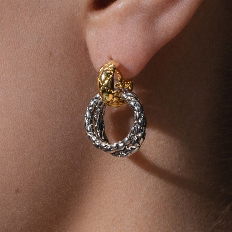 Pendientes de aro, chapados en oro, con colgante de doble círculo irregular.