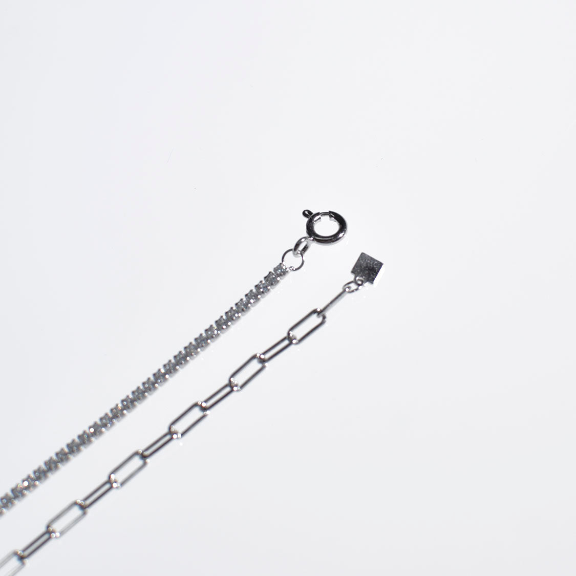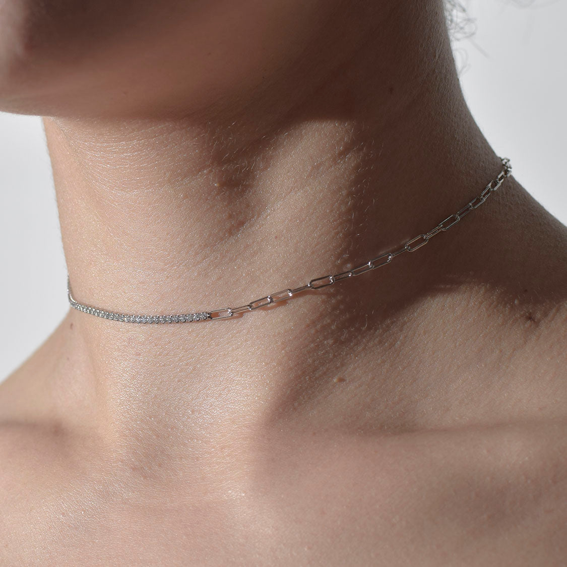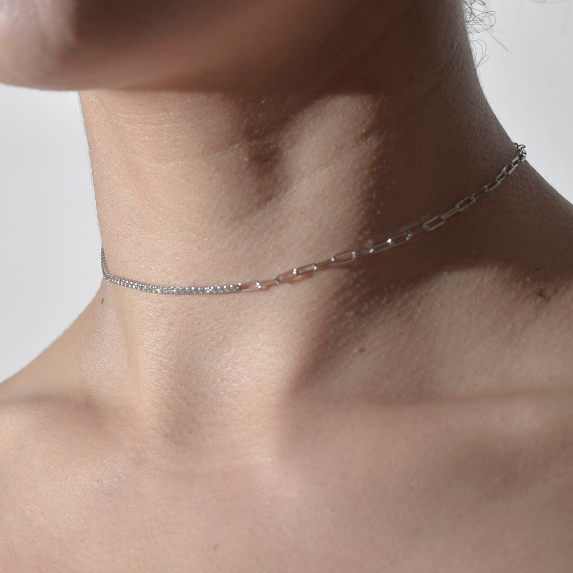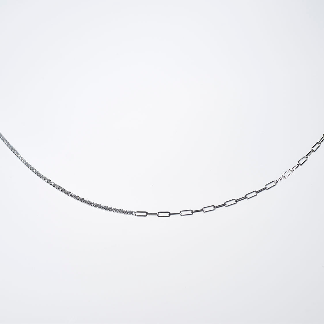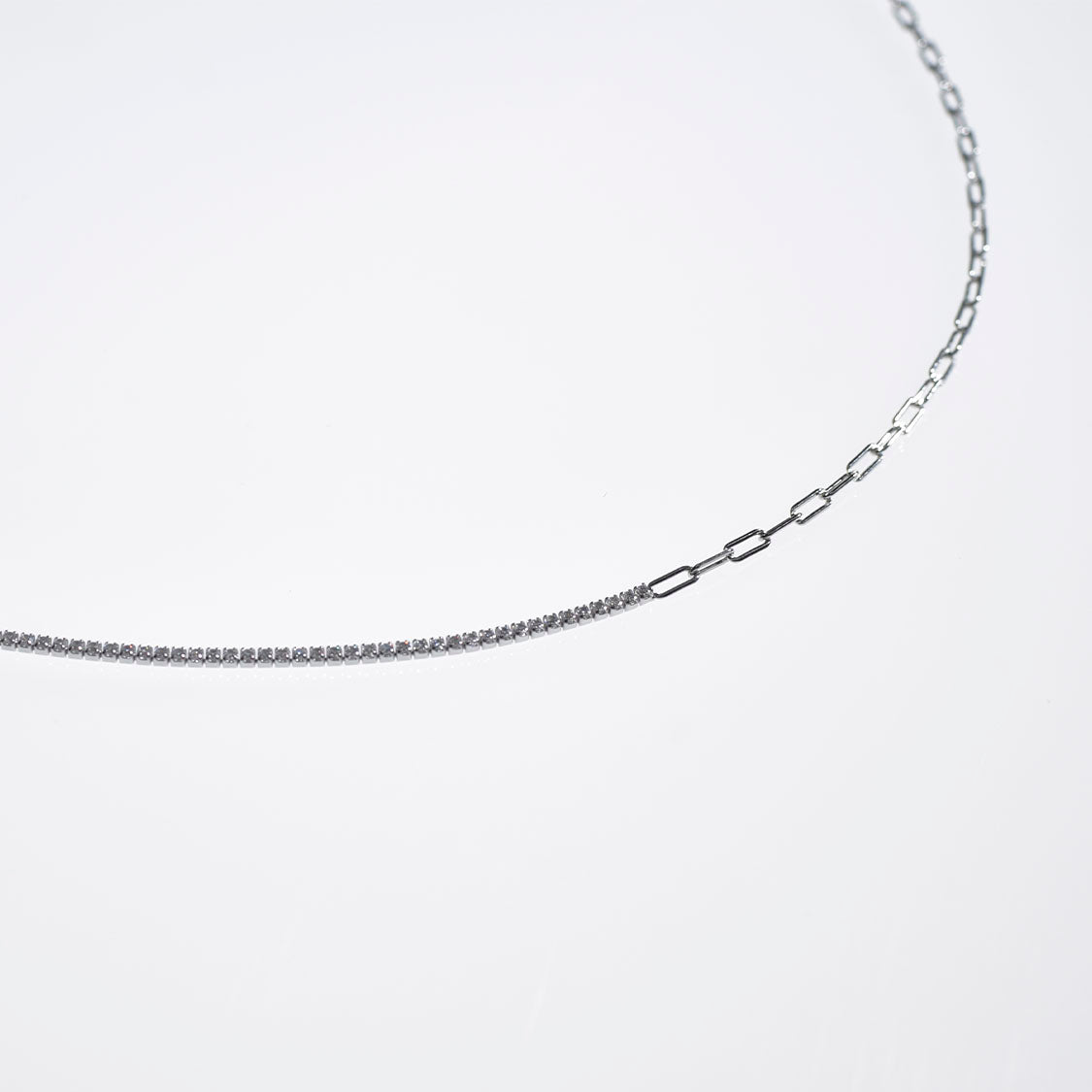 Cadena en Plata de Ley .925 con zirconia, mitad cadena, mitad zirconia transparente revestimiento de rodio.