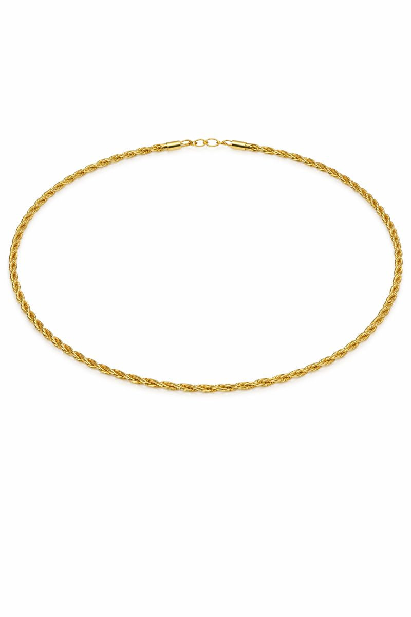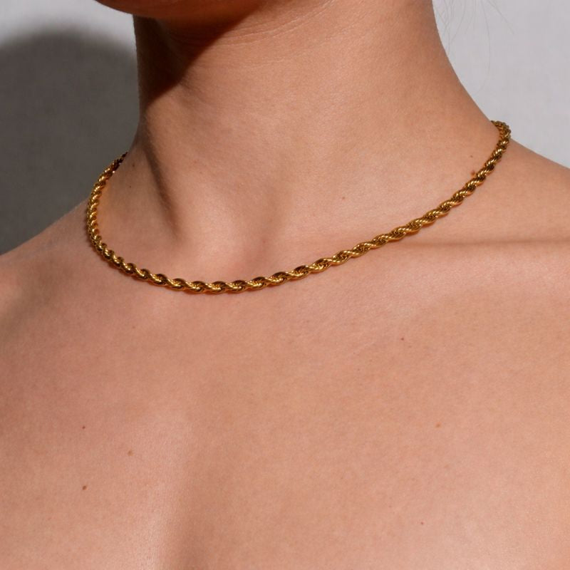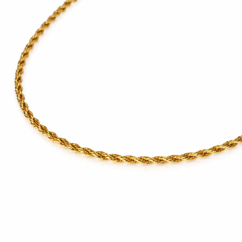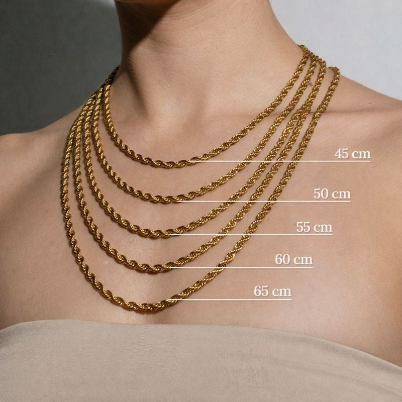 Este collar de acero inoxidable bañado en oro 18K presenta un diseño duradero de cadena de cuerda retorcida, disponible en ancho de 4mm, con longitud de 45,50,55,60,65cm. Se venden por separado.