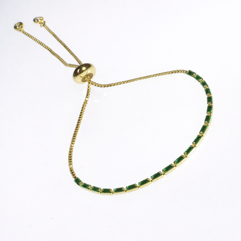 Pulsera ajustable con zirconia rectangulares de diferentes colores.