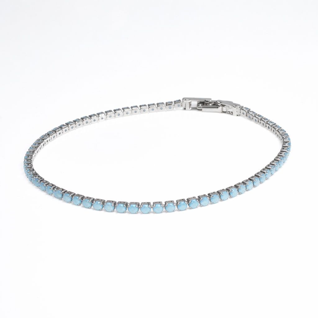 Pulsera tipo tenis de zirconia azul con baño de oro en 18k.