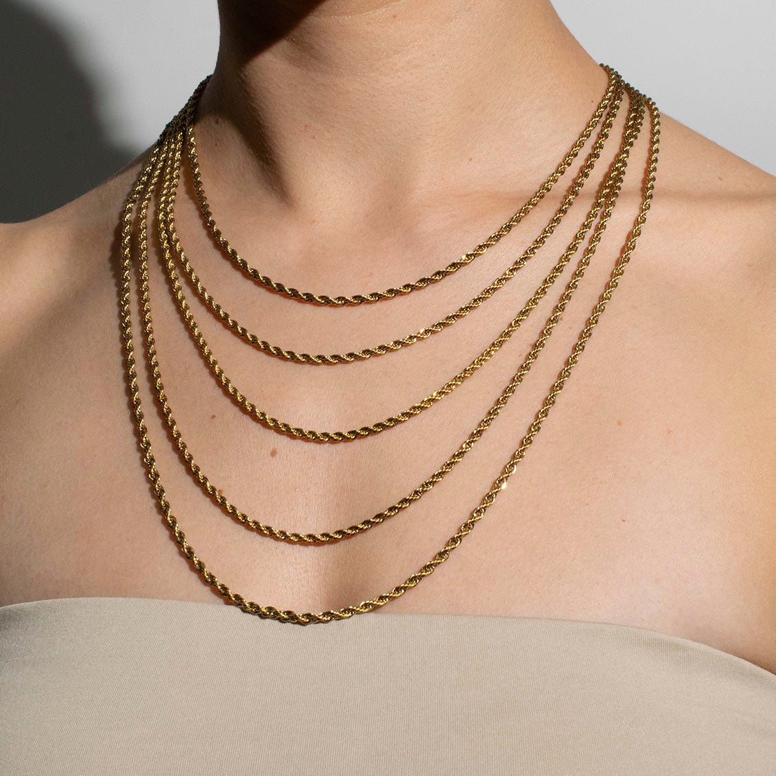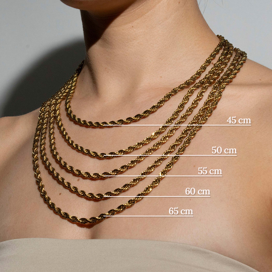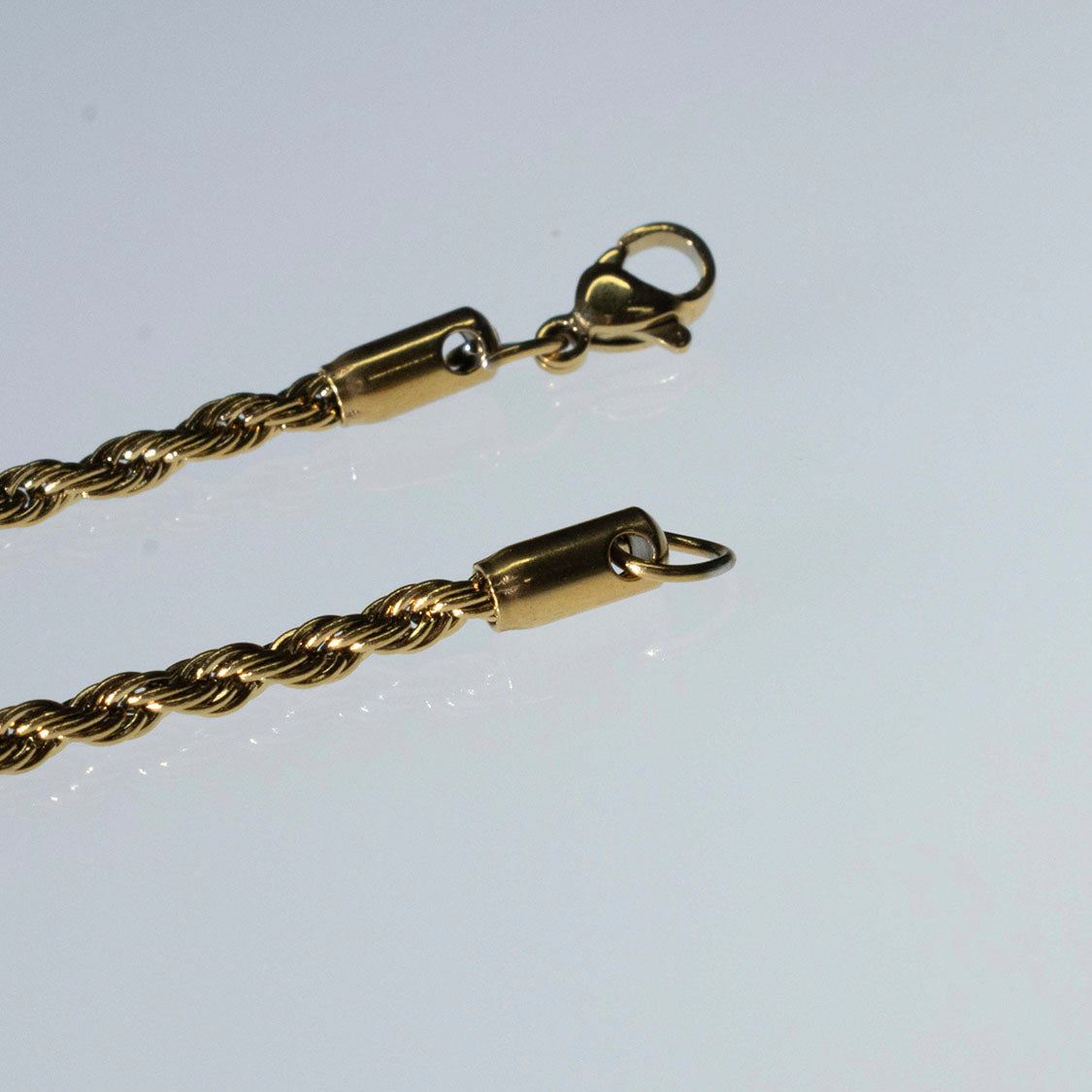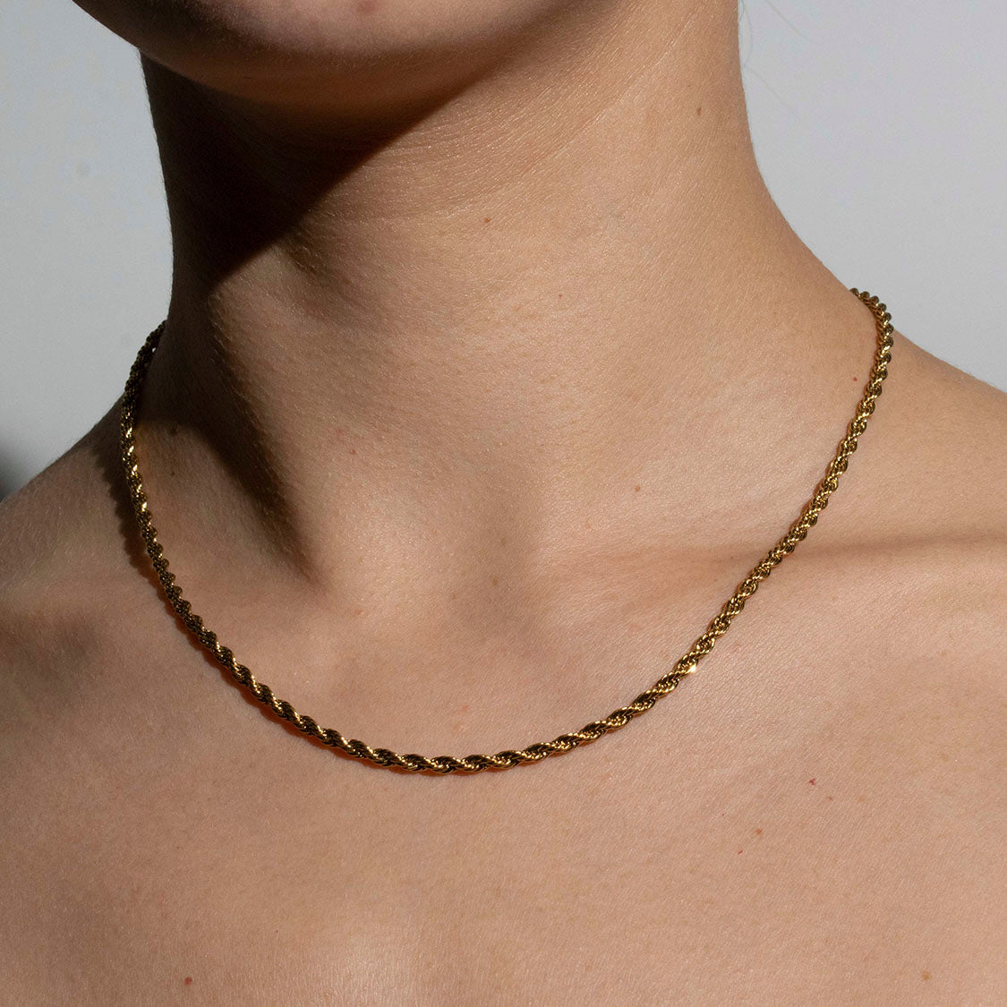 Este collar de acero inoxidable bañado en oro 18K presenta un diseño duradero de cadena de cuerda retorcida, disponible en ancho de 3 mm, con longitud de 45cm