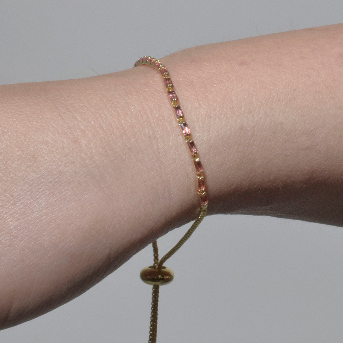 Pulsera ajustable con zirconia rectangulares de diferentes colores.